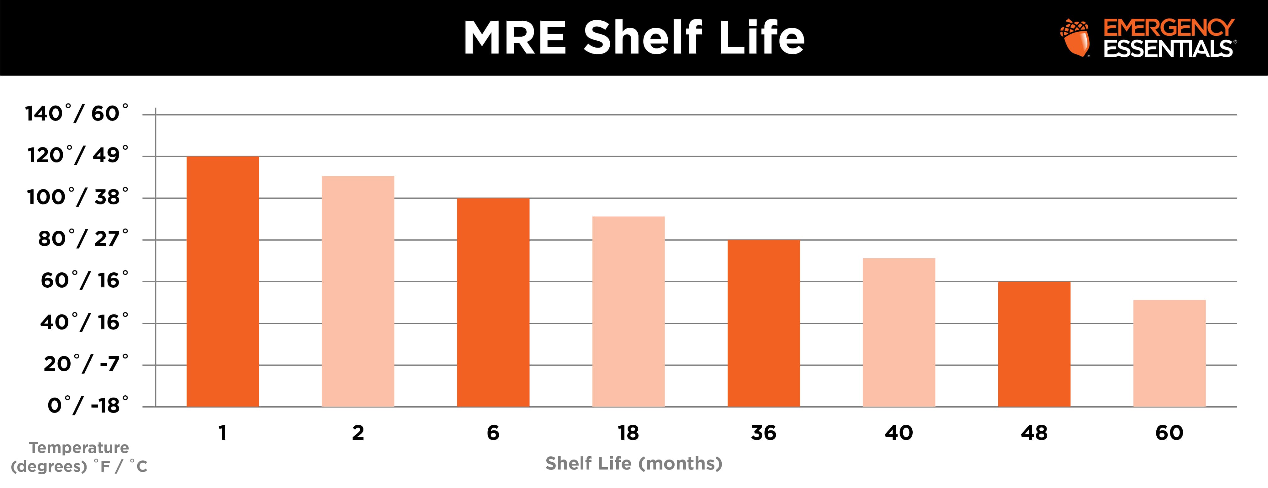 The shelf life ratings shown in the chart above. If the meals are stored at a temperature of 80 degrees F267 degrees C the current shelf life chart. The new chart only goes up to 60 months of shelf life 5 years at 50F vs.